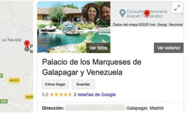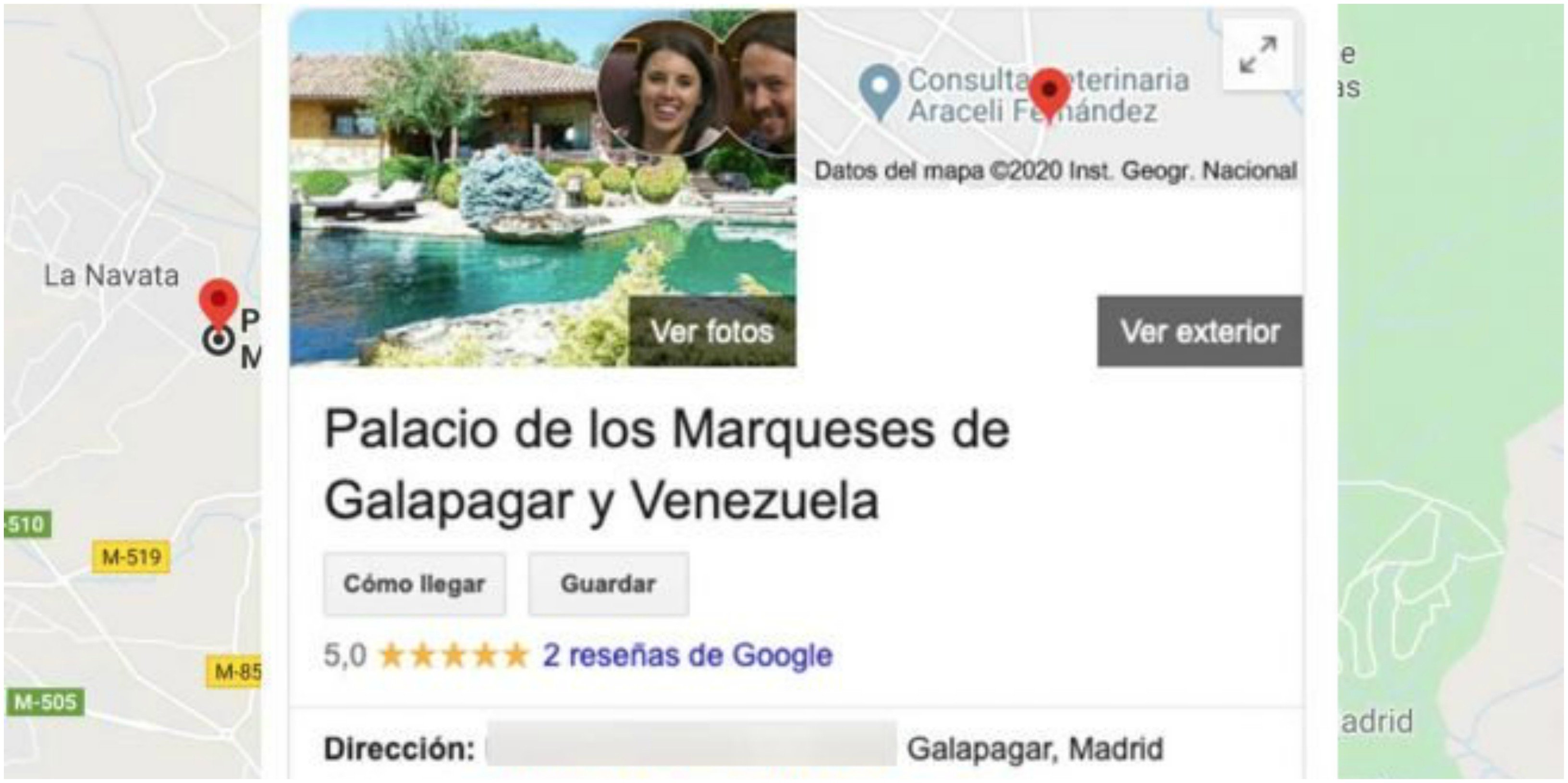 El chalet de más de 600.000 euros -dicen- en el que viven el vicepresidente Pablo Iglesias y la ministra de Igualdad, Irene Montero, aparece ahora en Google como Palacio de los Marqueses de Galapagar y Venezuela. Un anónimo ha utilizado una herramienta del navegador para 'trolear' a la pareja.
