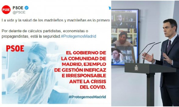 El PSOE critica en un tuit a la CAM por su mala gestión del coronavirus. Pedro Sánchez responde a los periodistas: Yo no sabía nada, estoy a lo mío... Si sólo soy el secretario general del partido