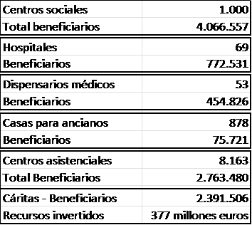La Iglesia Católica española atiende los servicios sociales que se detallan seguidamente, acerca de los que no he encontrado dato alguno que pudiera indicar algo similar por parte de ningún partido político, sindicato, cualquier otra religión o asociación cultural o social de tipo alguno, y cuyo inventario monetario no he podido efectuar, ni por aproximación, dada la amplitud y complejidad de esa labor y los millones de personas que se benefician de ella.