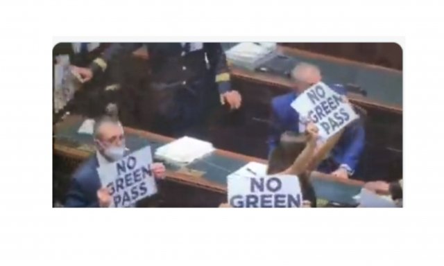 Los diputados de la formación conservadora nacionalista Hermanos de Italia han interrumpido la sesión del Parlamento italiano portando pancartas contra el pasaporte Covid. "No green pass" se podía leer en los carteles.
