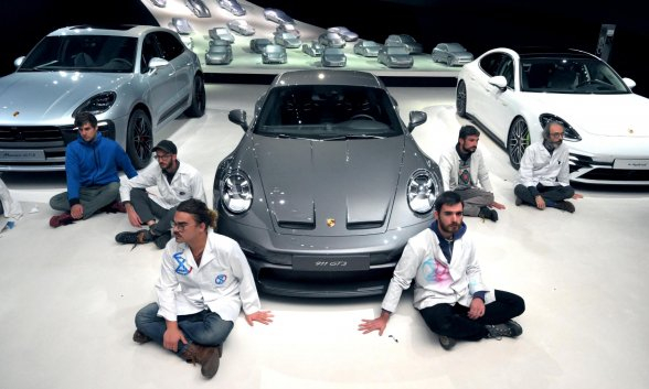Un grupo de activistas climáticos se pega con cola al suelo de un pabellón de Volkswagen, pero pide que no les apaguen la calefacción y que les traigan un cubo para orinar y defecar.