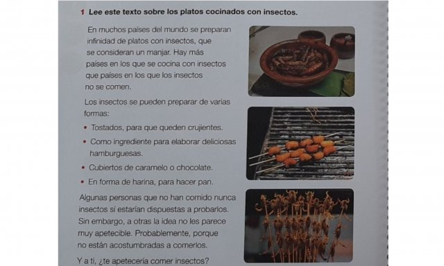 Según Vozpópuli, son contenidos del 'Concurso de cocina', dentro de Lengua y Literatura. "En muchos países del mundo se preparan infinidad de platos con insectos, que se consideran un manjar. Hay más países en los que se cocina con insectos que países en los que los insectos no se comen", arranca. Y añade: "los insectos se pueden preparar de varias formas: tostados, para que queden crujientes; como ingrediente para elaborar deliciosas hamburguesas; cubiertos de caramelo o chocolate o en forma de harina, para hacer pan". Por último, el texto explica que "algunas personas que no han comido nunca insectos sí estarían dispuestas a probarlos". "Sin embargo, a otras, la idea no les parece muy apetecible. Probablemente, porque no están acostumbradas a comerlos. Y a ti, ¿te apetecería comer insectos?", concluye para después proponer una serie de ejercicios.