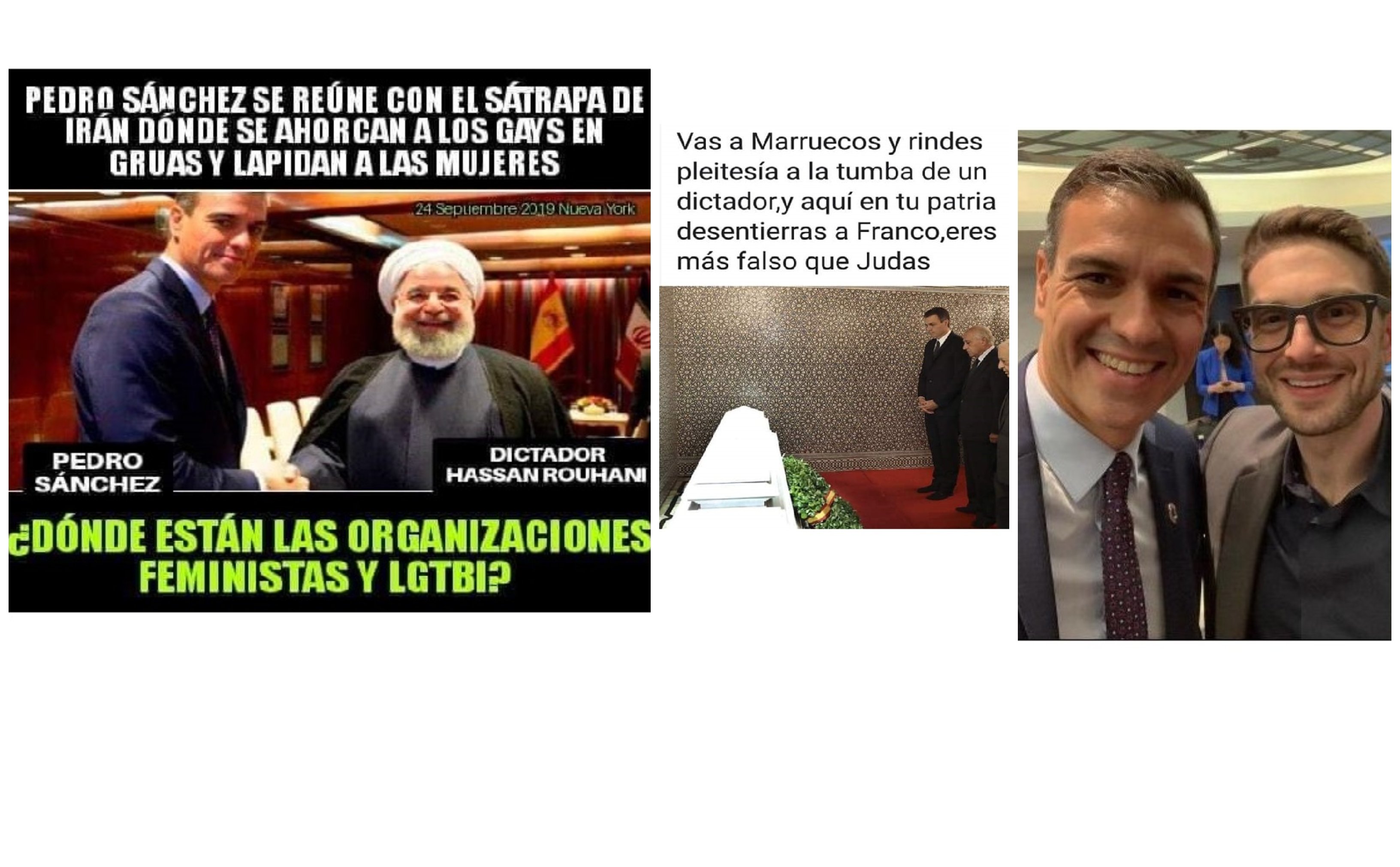 Muy sencillo: tres imágenes. En la primera, Pedro Sánchez aparece durante uno de sus primeros viajes oficiales, en un acto de enaltecimiento y oculto a los reyes de Marruecos, Mohamed V y Hassan II, dos profundos demócratas.