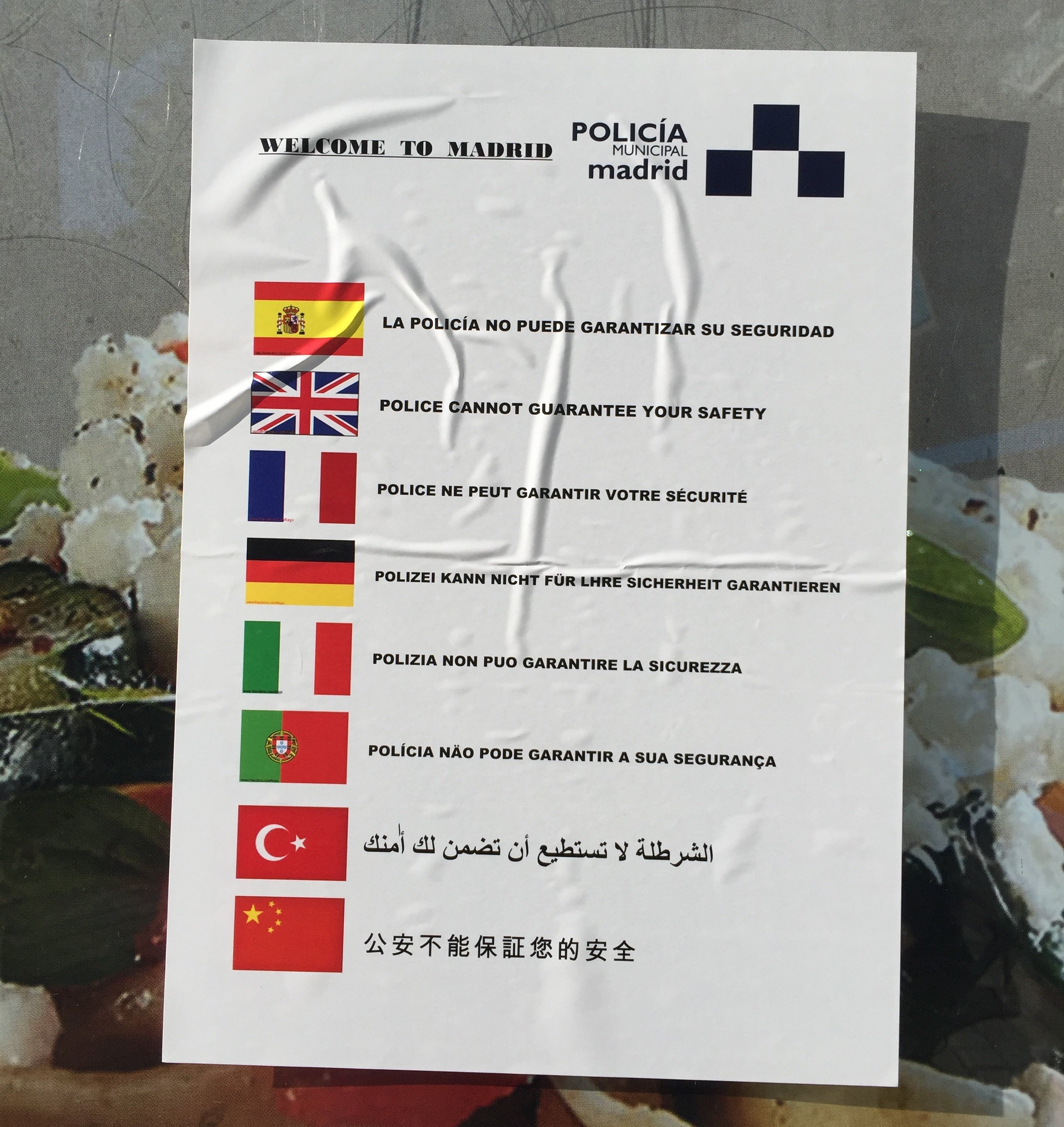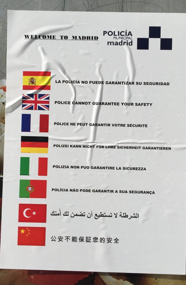 Efectivamente, empapelar lugares emblemáticos de la ciudad con la frase “la policía no puede garantizar su seguridad”, en ocho idiomas, no va en contra de Manuela Carmena ni de su concejal Barbero. Va en contra de todos los madrileños y del resto de españoles.
