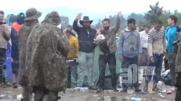 soldados macedonios intentando repartir comidas entre refugiados sirios, pero estos no la aceptan porque lleva el emblema de la