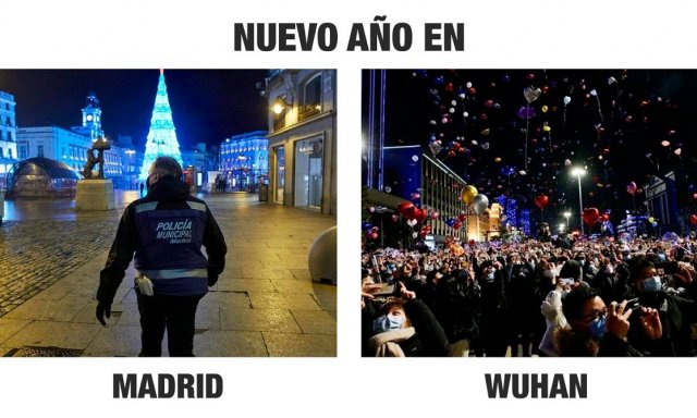Continúa el engaño. No es de extrañar que alguien haya unido las calles de Madrid y de la ciudad china de Wuhan, origen del coronavirus, durante la noche de fin de año. Madrid vacía, Wuhan en explosión de colorido y risas argentinas, oh sí.