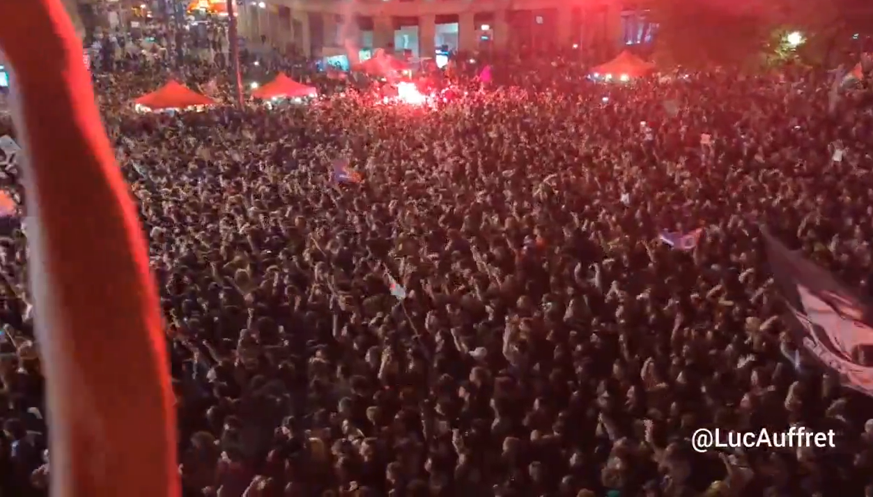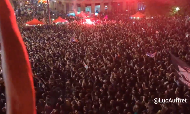 Circula por las redes este minivídeo. Quien me lo envía recalca en el titular, y creo que es interesante reproducirlo, que no se ve ni una sola bandera francesa. Se trata una celebración del 'triunfo' del Frente Popular francés, se supone que capitaneado por el comunista Jean-Luc Mélenchon.