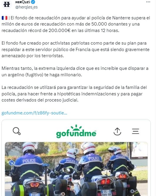 Ejemplo: en el sucedido anterior que incendiado Francia, se han abierto dos cuestaciones populares digitales: la una a favor de Nahel, la otra, a favor del policía, hoy detenido. Pues bien, el muerto ha recopilado 200.000 euros, el policía, pregunto delincuente, ha recaudado un millón de euros cinco veces más.