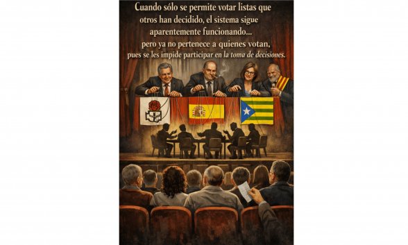 En España, el votante no controla la oferta política, no decide el ejecutivo y no puede vigilar individualmente a sus representantes. Participa en una escenificación donde la decisión final se concentra en pequeños comités de notables de los diversos grupos que concurren a las elecciones.