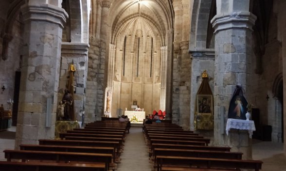 Nave central vista hacia el presbiterio y de espaldas al presbiterio, y la girola donde se abren las capillas de los siglos XVI y XVII
