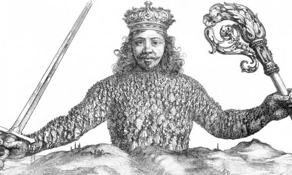 Detalle de la portada del libro de Tomas Hobbes, en el que aparece Leviatán empuñando una espada y un báculo, para señalar que el poder civil y religioso le están sometidos. Nótese que el cuerpo de Leviatán lo forman las figuras de hombrecillos, para indicar que los hombres han renunciado a sus derechos, entregándoselos a Leviatán con el fin de que él les indique lo que se debe hacer