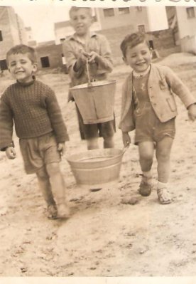 Como no había agua corriente en mi casa, había que ir a la fuente a por ella. A juzgar por las caras de mi hermano Jesús (con chaqueta) y la mía, el transporte tenía que ser divertido. Por la fecha que figura al dorso de la foto, yo tenía cuatro años y medio.