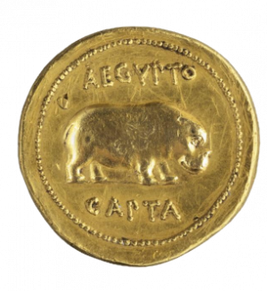Cuaternión de Augusto, moneda acuñada al año 27 a.C., fecha en la que es proclamado emperador –el que ostenta el mando militar– y recibe el título de Augusto para conmemorar la conquista de Egipto, lograda a raíz de la batalla de Actium, y la posterior toma de Alejandría en el año 30 a.C. Este momento se representa en el reverso de la moneda con el hipopótamo como animal característico del Nilo y la leyenda, AEGYPTO CAPTA (Egipto conquistado)