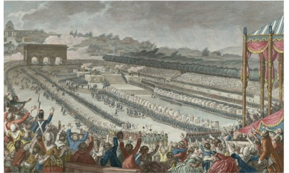 Enfrente de la Academia militar se extendía una zona de maniobras, conocido como Campo de Marte, y lo acondicionaron con gradas, para que pudiera acoger a 300.000 personas, que vieron desfilar a 50.000 militares con las banderas de los 83 departamentos recién creados. Y allí en el centro, profanando su ministerio episcopal, Talleyrand (1754-1838) junto con 300 sacerdotes oficiaron una "misa" en el llamado “altar de la patria”, para recoger el juramento ciudadano, lo que avala la sentencia de que cuando alguien deja de creer en Dios, acaba creyendo en cualquier cosa, aunque sea obispo o sacerdote.