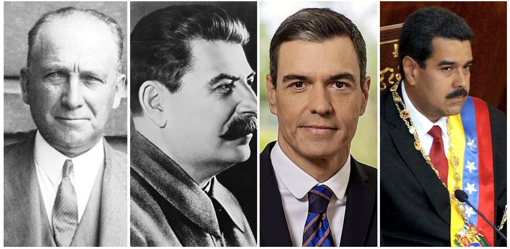 Francisco Largo Caballero (1869-1946), el Lenin español, es a Stalin (1878-1953), lo que Pedro Sánchez a Nicolás Maduro; es decir, Largo Caballero y Sánchez son dos embajadores del PSOE, en apoyo y defensa del comunismo. En consecuencia, esta actitud del presidente del Gobierno de España ayuda a entender la inquina de Pedro Sánchez contra todo aquel que se haya opuesto al comunismo, como por ejemplo Franco (1892-1975), considerado como uno de los personajes del siglo XX que con mayor tenacidad y eficacia se empleó contra el régimen totalitario del comunismo.