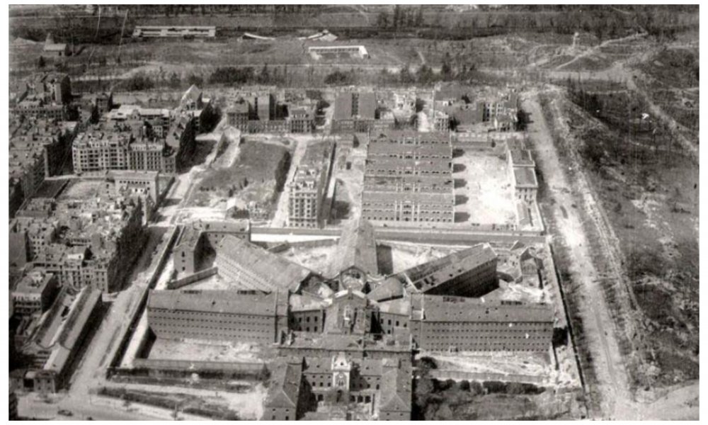 “El inmenso penal ocupa seis manzanas del barrio de Argüelles entre las calles Moret, Martín de los Heros, Romero Robledo y plaza de la Moncloa. Consta de una fachada y un cuerpo central del que arrancan en abanico cinco galerías con sus cinco patios correspondientes. Tiene mil celdas; 200 en cada galería. Desde el principio nos instalan cinco personas en cada celda, o sea mil por galería y en los últimos meses hasta siete y ocho por celda.