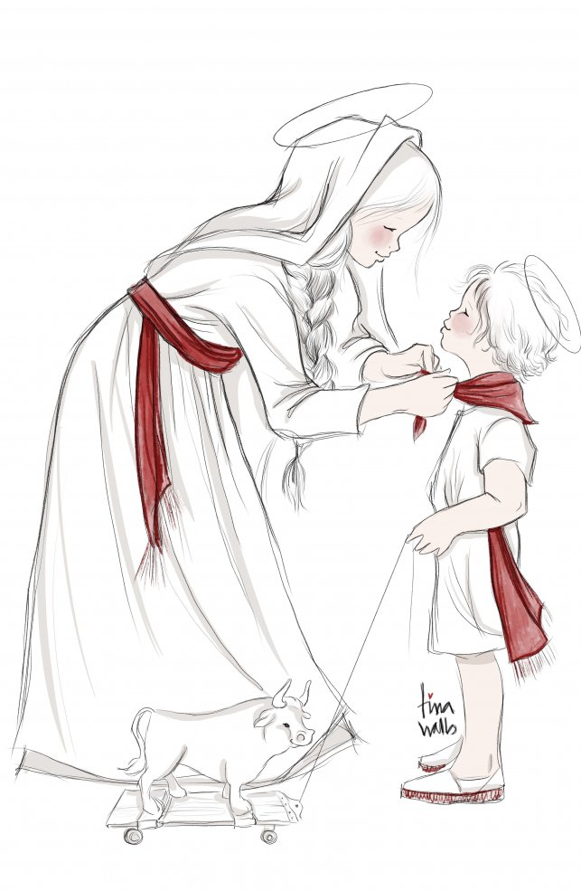 Los dibujos de Tina Walls conectan el cielo con la tierra, lo divino con lo humano, son auténticos y verdaderos. Por eso, lo mismo que por sus orígenes navarros, ya que su madre es una “PTV” (de Pamplona de Toda la Vida), Tina Walls en uno de sus dibujos más celebrados en la red representa a la Virgen María atando el pañuelico rojo en el cuello del Niño Jesús, al que San José le ha hecho un torito de juguete, y por esa misma autenticidad Tina Walls rompe con la tradicional representación de la Anunciación y San Gabriel, y sorprenda a la Virgen barriendo. ¡Pero en qué cabeza cabe que la Virgen solo tenía presencia de Dios cuando rezaba y la perdía cuando hacía las faenas de la casa!