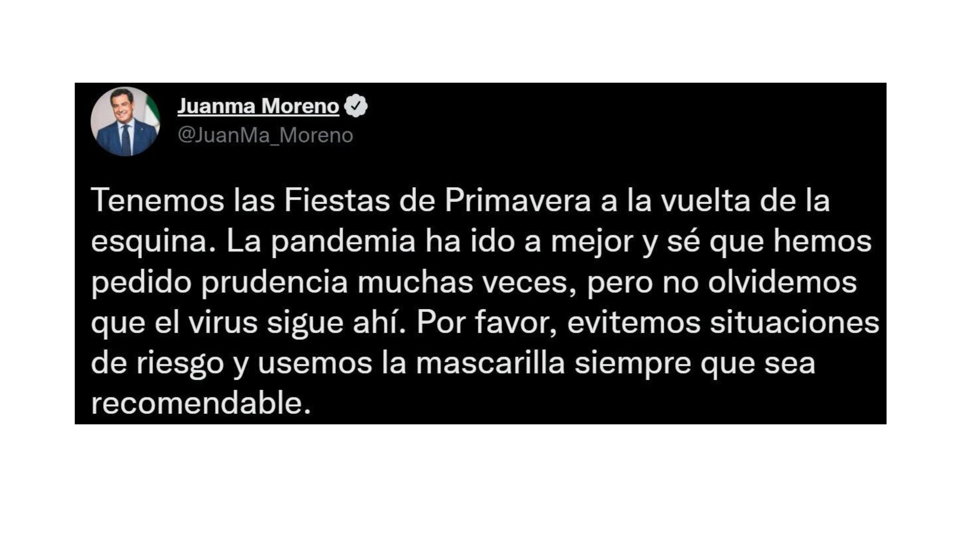 Pues bien, la primera en la frente. Vean el mensaje del incomensurable presidente de la Junta de Andalucía, Juan Manuel Moreno Bonilla, progre de derechas de toda la vida. No habla de Semana Santa, que es lenguaje poco laico, sino de “fiestas de primavera”. ¡Qué hermoso!