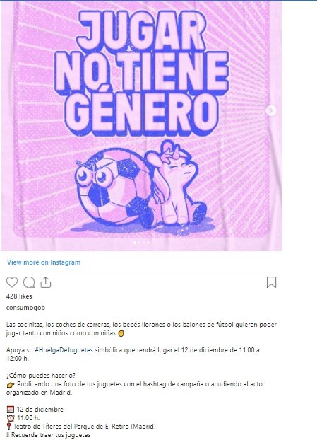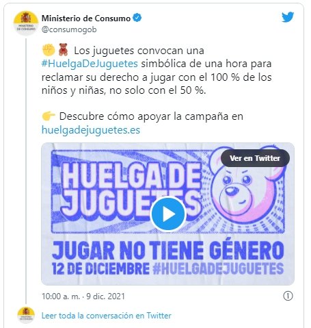 El Ministerio de Consumo ha lanzado una campaña de protesta para sensibilizar sobre el impacto negativo de la publicidad sexista en el sector de los juguetes. Bajo la etiqueta simbólica #HuelgaDeJuguetes y a través de un vídeo de animación, cuyo coste con cargo a las arcas públicas ha superado los 80.000 euros, distintos personajes de animación llaman a las familias con hijos menores a unirse a su reivindicación. El objetivo central es sensibilizar sobre «el problema que supone que (a los juguetes) solo les dejen jugar con la mitad de la población infantil y concienciar de que jugar no tiene género».
