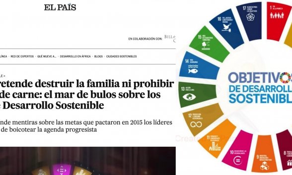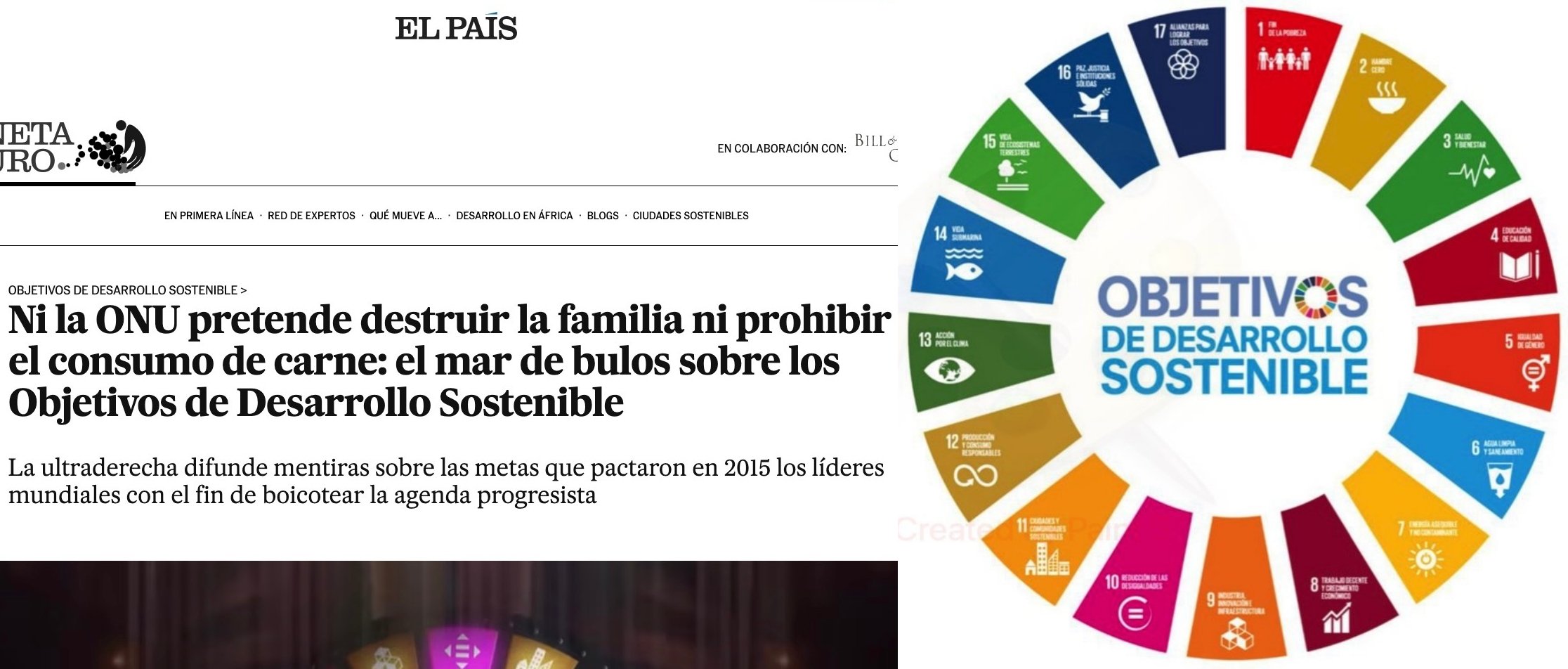 Artículo publicado en El País el martes 19 de septiembre: “Ni la ONU pretende destruir la familia ni prohibir el consumo de carne: el mar de bulos sobre los Objetivos de Desarrollo Sostenible”. Ya en el subtítulo, la redactora aclara, por si alguien dudaba, que los culpables son los ultraderechistas que quieren “boicotear” la agenda progresista.