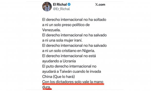 Decíamos ayer que el derecho internacional, el orden multilateral, un mundo regido por leyes y otros tópicos, gente, según sus promotores, desde el final de la II Guerra Mundial (1945), y un lugar, un mundo regido por ley y orden y otras solemnísimas evidencias no han conseguido que, por ejemplo, el chavismo haya dejado de torturar y asesinar a los venezolanos que se oponían a él. Y lo mismo, o más, pueden decirse de Irán, sólo que más porque la tiranía persa dura más que la venezolana.