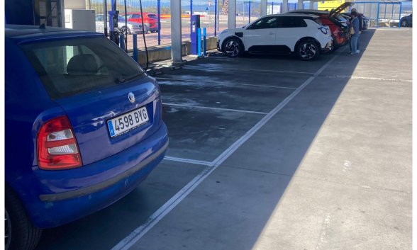 Está lleno, sólo hay tres plazas vacías, las tres para cargadores de coche eléctrico. Sólo que no hay ningún coche eléctrico.