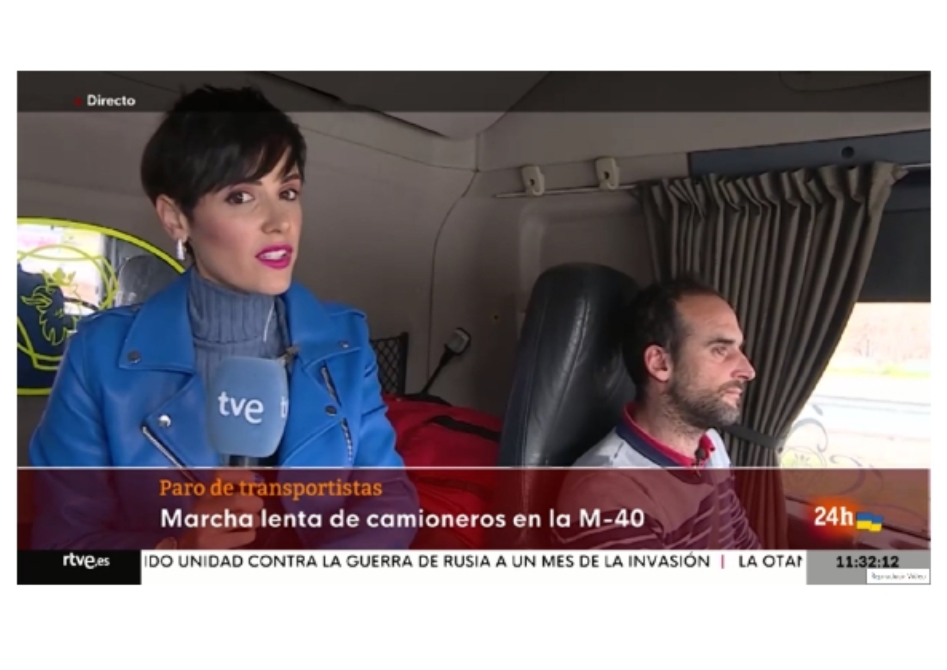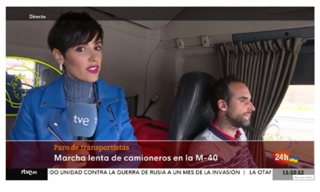 El informativo del canal 24 horas se ocupa de la huelga de transportistas. La reportera, para transmitir todo el realismo posible, se sube a un camión de los que participan en una de las marchas lentas que en los últimos días recorren distintas ciudades de España.