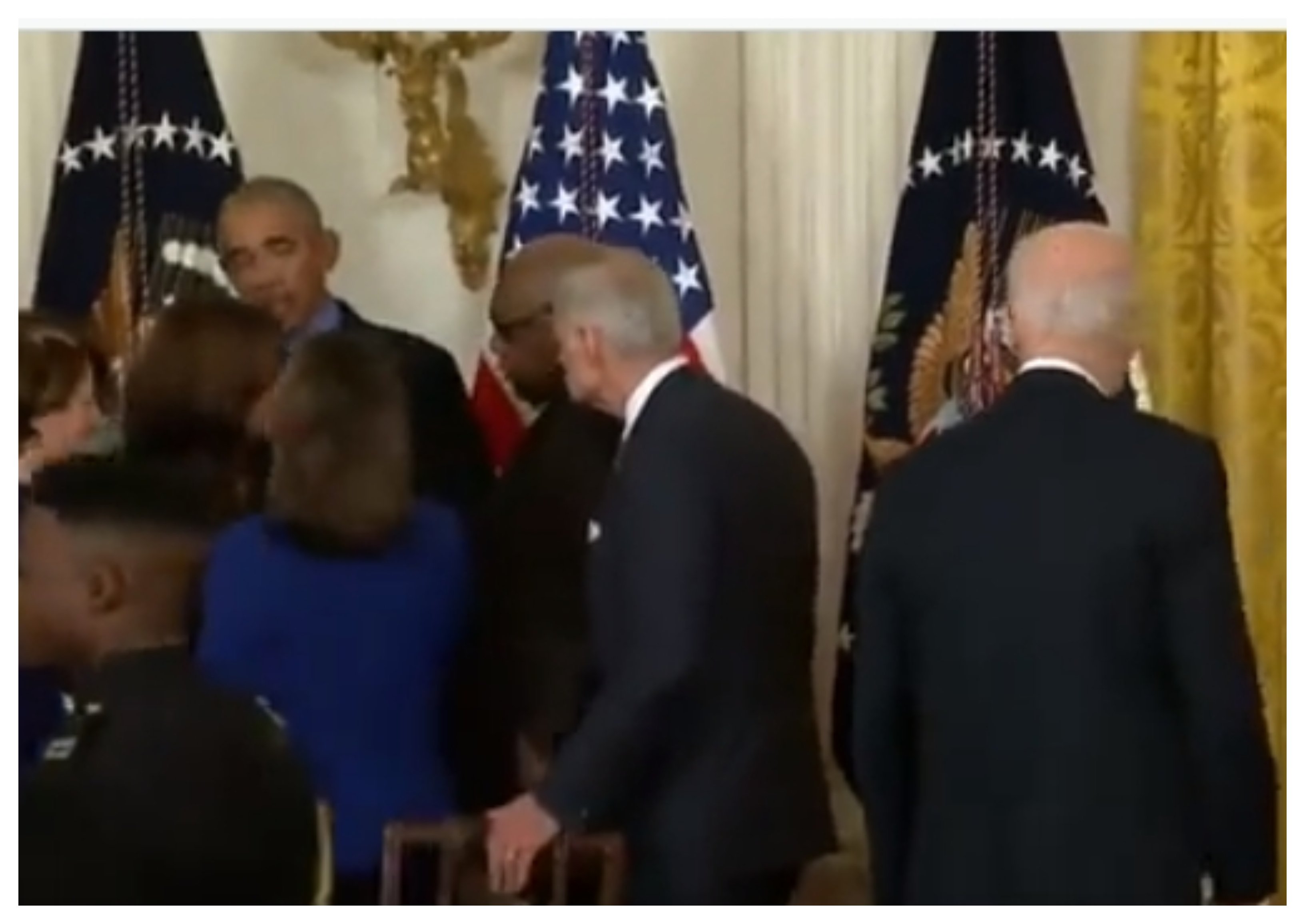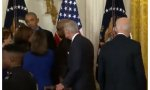 Los vídeos engañan si se observan apresuradamente. Puede tratarse de una coincidencia de gestos pero parece claro que, al menos en estas instantáneas, es Obama quien recibe el tributo de la progresía washingtoniana.