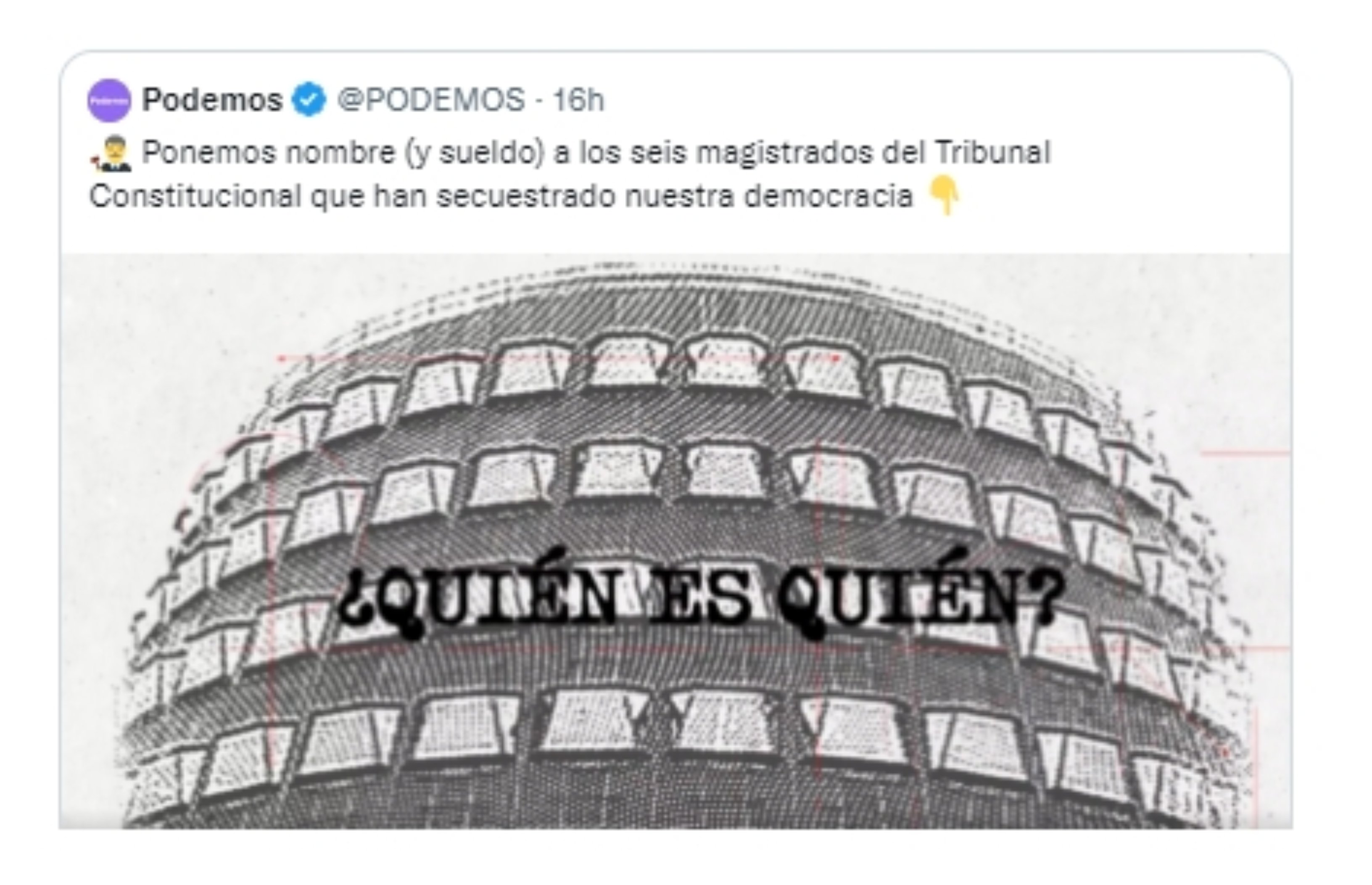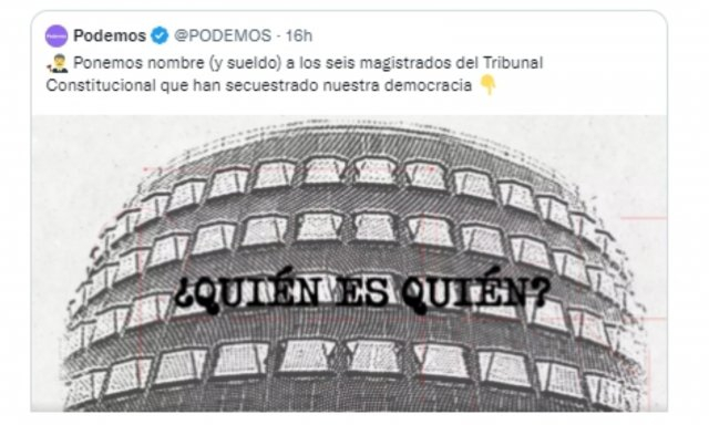 Podemos protagoniza una de sus 'pataletas', que sufren los morados cuando las cosas no salen como ellos quieren: así, ha lanzado en redes una campaña para criticar a los seis magistrados conservadores que decantaron por la suspensión cautelar de la reforma para su renovación sin completar la tramitación parlamentaria, que con su actitud han "secuestrado la democracia".