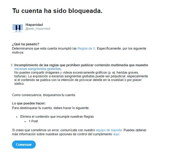 La red social X (antes Twitter) de Elon Musk también censura. Al menos, a Hispanidad. El lunes 7 publicábamos la noticia: Sheinbaum, empiezas bien: decapitado el alcalde de Chilpancingo, Alejandro Arcos Catalán, tras sólo seis días en el cargo. Su difusión le ha costado a Hispanidad el bloqueo/censura de nuestra cuenta de X.