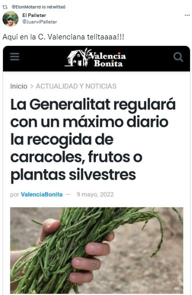 Además, el nuevo Reglamento Forestal de la Comunitat Valenciana fijará un máximo al día de espárragos, caracoles y setas, entre otros, estableciendo que la recogida estará sujeta a las restricciones de protección de especies, tal y como publica Levante EMV.