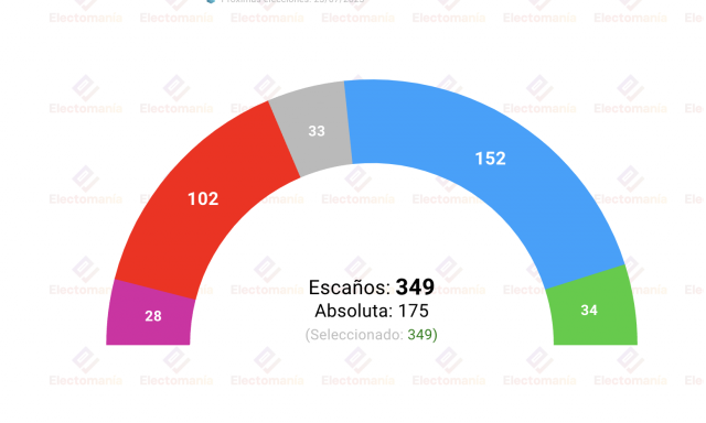 La primera de SigmaDos para El Mundo, recogida por electomanía: "subidón del PSOE, que deja a PP+Vox en los 176". El sondeo concede la absoluta al bloque de derechas, pero llegan de manera muy ajustada: con un PP que se haría con los 145 escaños y el 34,6% del voto y Vox que sacaría 31 diputados y el 11,9%. La suma de ambas formaciones da la mayoría suficiente para formar Gobierno, al quedarse en los 176 escaños en los que se fija la absoluta. Por dos diputados, Yolanda Díaz con Sumar englobando a Podemos, se convertiría en la tercera fuerza política con 33 representantes y el 12,6% del voto. Sánchez, por su lado, caería a los 103 asientos en el hemiciclo.