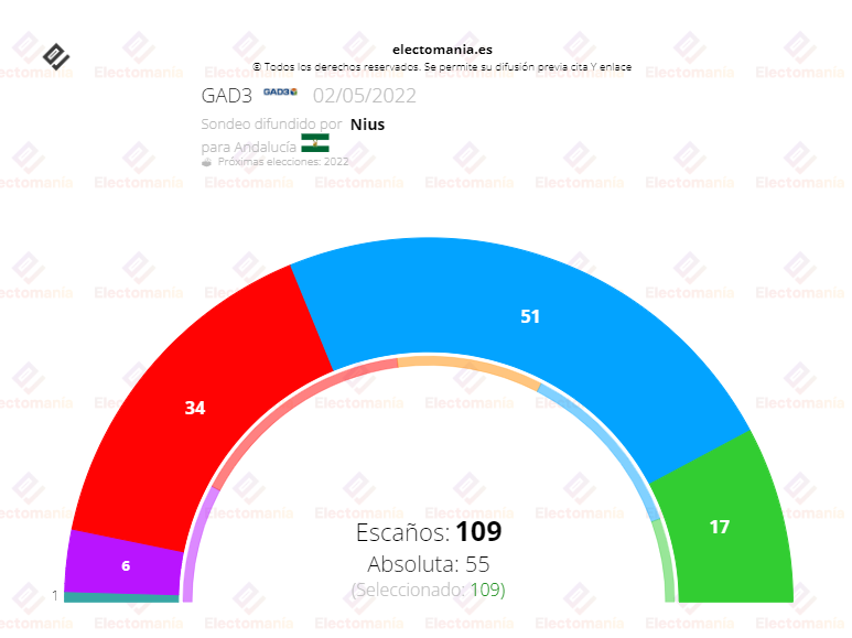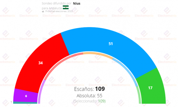 Y este lunes se publica una nueva encuesta de GAD3 -recogida por Electomania- según la cual el PP obtendría el 38,2% y 51 escaños. En segunda posición encontramos al PSOE de Juan Espadas, que se haría con el 27,6% y 34 escaños. Según los datos, Vox obtendría el 14% y 17 escaños. Por Andalucía, la coalición de Más País, Equo, Alianza Verde, Iniciativa del Pueblo Andaluz y Unidas Podemos, sacaría el 7,8% y 6 asientos. Adelante Andalucía se queda con 1 escaño y el 3,5%. Y Ciudadanos, con en todas las encuestas, desaparece de Andalucía.