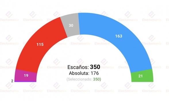 Vox bajaría hasta los 21 escaños, de los 33 actuales que tiene, aunque resiste como tercera fuerza política, Sumar bajaría hasta los 21 representantes. El PP repetiría como ganador de las elecciones con una espectacular subida a 163 diputados y Sánchez se quedaría con 115.