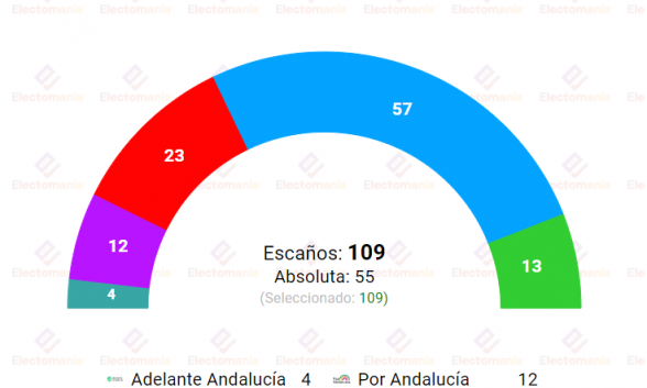 En resumen: el PSOE se hundía, Podemos se despeñaba, Vox se estancaba, Ciudadanos desaparecía. Hoy el CIS andaluz publica una encuesta, que recoge Electomanía, en la que Moreno Bonilla sigue subiendo y obtiene 57 representantes en el Parlamento de Andalucía, con una holgada mayoría: parece que los votantes salen del PSOE, que se hunde completamente a 23 escaños. Por su lado Vox, que pasó de ser necesario para formar Gobierno a ser irrelevantes, pese a mejorar el resultado, sigue estancado con 13 representantes. Además, Por Andalucía obtendría 12 escaños y Adelante Andalucía 4.