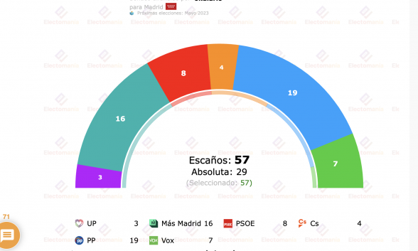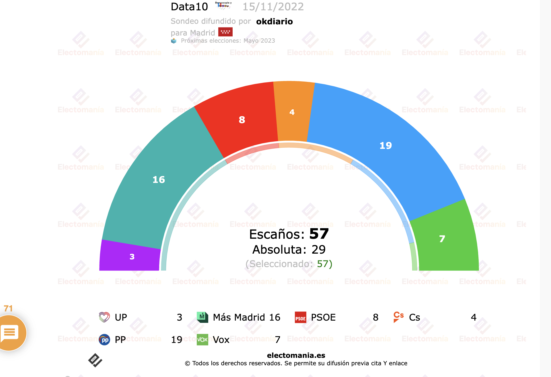 Y es que, como ya hemos dicho en Hispanidad, Almeida no termina de convencer a los madrileños: el PP obtendría 19 representantes, diez por debajo de la absoluta, por lo que necesitaría a Vox, que tendría 7 asientos y a Ciudadanos, que a diferencia de lo que ocurre en el resto de España, en Madrid sigue vivo con cuatro representantes. Resultado ajustado ya que Más Madrid disfrutaría de 16 representantes, el PSOE, con Reyes Maroto como candidata obligada, se quedaría con 8, y Unidas Podemos sacaría 3, una suma que daría 27, a dos de la absoluta.