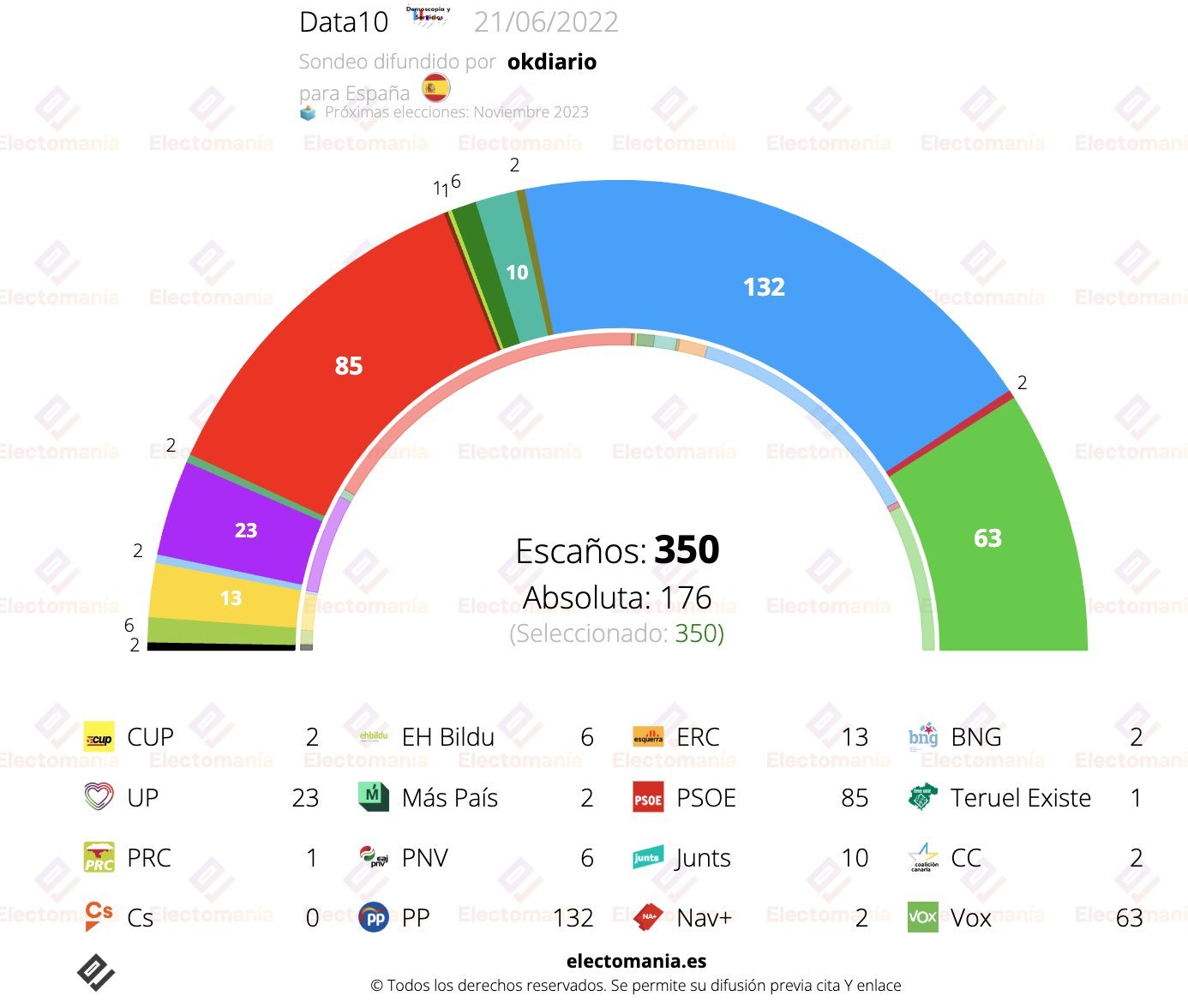 Lo que se traduce en dos hechos. El derrocamiento de Pedro Sánchez, que se quedaría completamente debilitado cayendo a los 85 diputados y al 22,4% de los votos. Y por otro lado, pese a que Feijóo resultaría ganador, seguiría necesitando pactar con Vox: los de Abascal quedarían como tercera fuerza política con el 19,7% de los votos y 63 representantes. Ambas fuerzas de derecha sumarían 195, suficiente para superar la mayoría que se sitúa en 176 diputados.