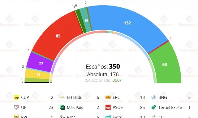 Los independentistas de ERC, con un 3%, sí tendrían 13 representantes, y el PNV obtendría el 1,3%, con 6 diputados, por delante, los separatistas de JxCat, con el 2,2% y 10 escaños. Por su lado, los pro-etarras de EH Bildu, con el 1,4 por ciento se quedarían con 6 miembros en el Congreso y la CUP ocuparía 2 asientos. El BNG se quedaría con el 0,7% de los votos y dos diputados, le siguen, Navarra Suma, con el 0,4% y 2 diputados, al igual que Coalición Canaria, Teruel Existe y PRC, obtendrían también un representante por cada formación.