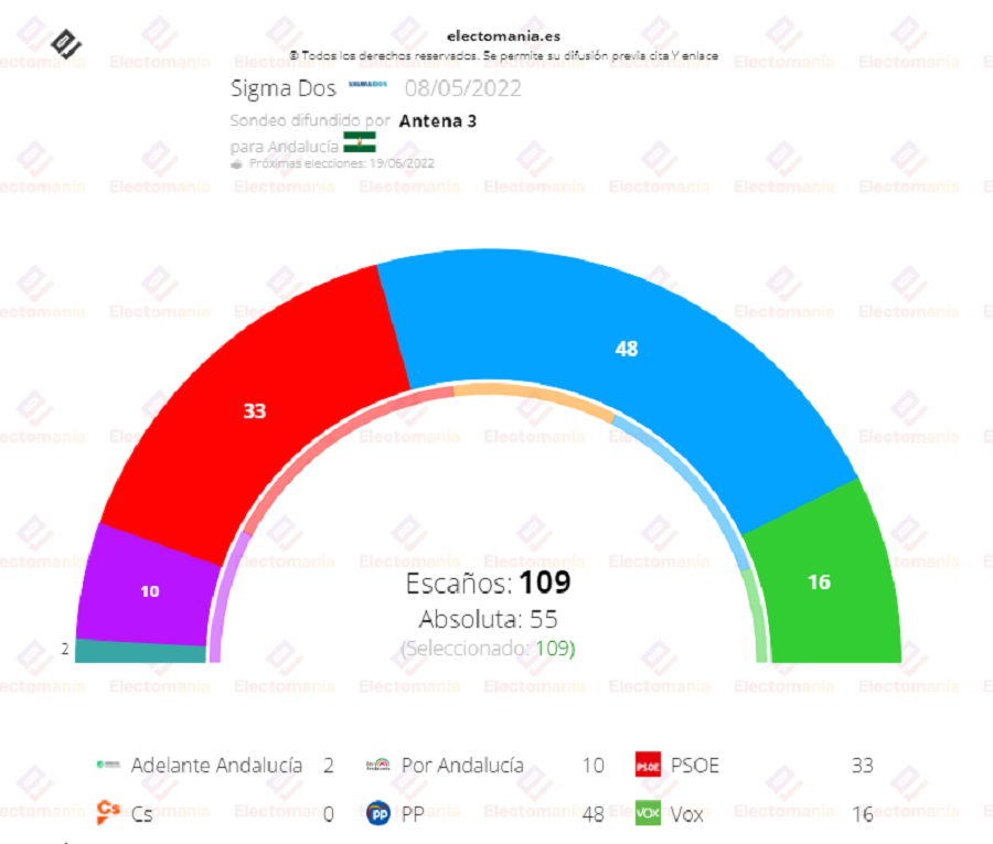 Nueva encuesta de Sigma Dos para Antena 3, que recoge Electomanía, según la cual el PP obtendría el 35,9 % y 48 escaños. El PSOE sacaría el 26,4% y 33 escaños. Vox conseguiría el 14,7% y 16 asientos. Por Andalucía se haría con el 10,6% y 10 escaños. Adelante Andalucía sacaría el 4,6% y 2 asientos. Mientras que Ciudadanos se haría con el 4,2% y ningún escaño.