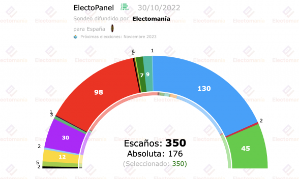 Por último, electopanel de electomanía, en la que saltan todas las alarmas: "Sube la izquierda, la suma de PP+Vox no alcanza la absoluta", Feijóo pierde el Gobierno por primera vez desde que fue nombrado representante de los populares, el gallego obtendría 130 diputados, con lo que, de sumar con Vox, no conseguiría la absoluta, puesto que los de Abascal se quedan con 45 escaños. Sánchez se recupera y obtendría 95 asientos en el hemiciclo, lo que le permitiría volver a pactar con sus socios favoritos: independentistas, pro etarras y comunistas. Unidas Podemos parece que también se recupera y se quedaría con 30 podemitas en el Congreso.