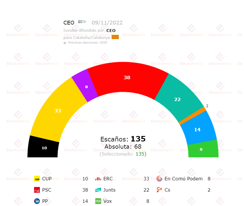 Esta es la primera encuenta del Centro de Estudios de Opinión realizada desde la salida de JxCat del Ejecutivo catalán, y según los datos, el PSC volvería a ganar las elecciones, y se ve una fuerte caída del partido de Carles Puigdemont y Laura Borràs que perderían hasta 13 escaños, lo que conlleva que las fuerzasa independentistas perderían la mayoría parlamentaria, aunque seguirían siendo más fuertes que los partidos constitucionalistas.