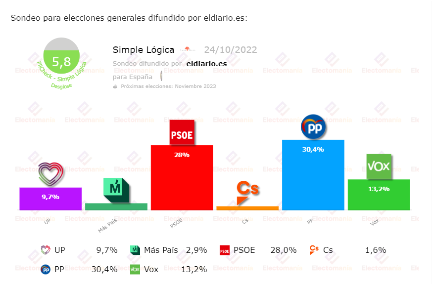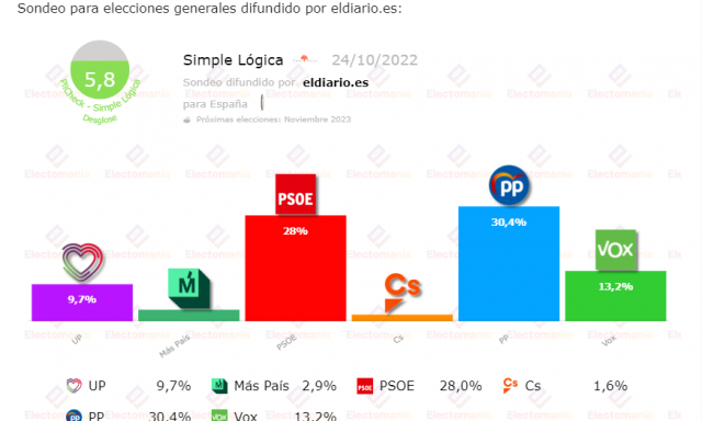 Encuesta de Simple Lógica para eldiario.es, recogida por electomanía. Si hace unos semanas Tezanos iba contra viento y marea y contradecía todas las encuestas, hoy martes le ha salido un seguidor a José Felix, y ese es Ignacio Escolar. En la encuesta publicada en su medio, Diario.es, da la victoria al PP con el 30,4% de los votos, pero se lo pone complicado a Feijóo, porque un recuperado Sánchez le da la vuelta a todos los sondeos y obtendría, según Escolar, el 28% de los votos, por lo que estaríamos caso ante un empate técnico. Después les seguiría Vox, de capa caída con el 13,2% de los votos y Unidas Podemos que se queda en el 9,7%.