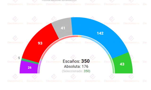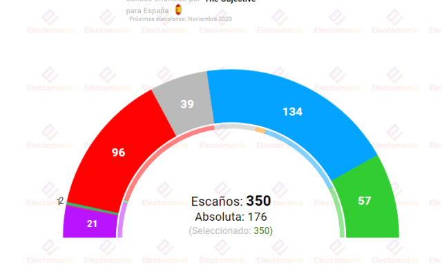 Las tres nuevas encuestas, dan la absoluta, situada en 176 escaños, a la suma de PP más Vox. En la primera, elaborada por Metroscopia para The Objective, recogida por Electomanía, Feijóo ganaría las elecciones con 134 diputados, que tendrían que pactar con los 57 que obtendría Vox, para lograr formar Gobierno. Los socialistas y podemitas, en caída libre, sacarían 96 y 21 representantes respectivamente.