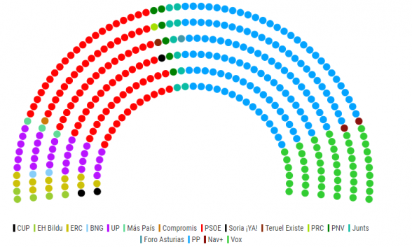 Recordemos los resultados de las últimas elecciones generales celebradas el 10 de noviembre de 2019: el PSOE sacó 120 escaños y el 28% de los votos. El PP, 89 y el 20,8%, Vox, 52 y el 15,1%, Podemos, 35 y el 12,8% y Ciudadanos, 10 y el 6,8%.