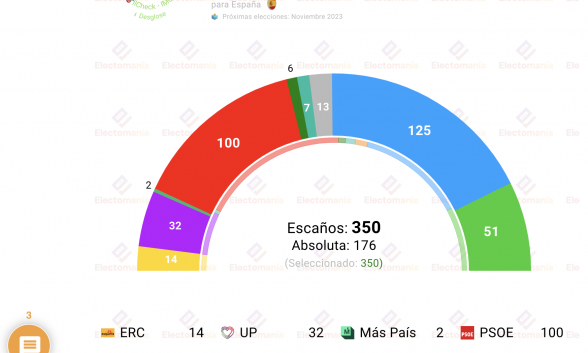 Sánchez se quedaría con 100 asientos en el hemiciclo y perdería el Gobierno, sus socios podemitas obtendrían 32 escaños, Más País 2, PNV 6, Junts 7 y ERC 14. Pero cuidado, porque la absoluta de la derecha es ajustada y podemos terminar con otros cuatro años de ejecutiva progresista.