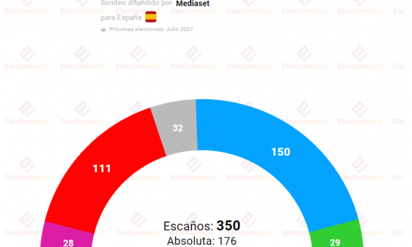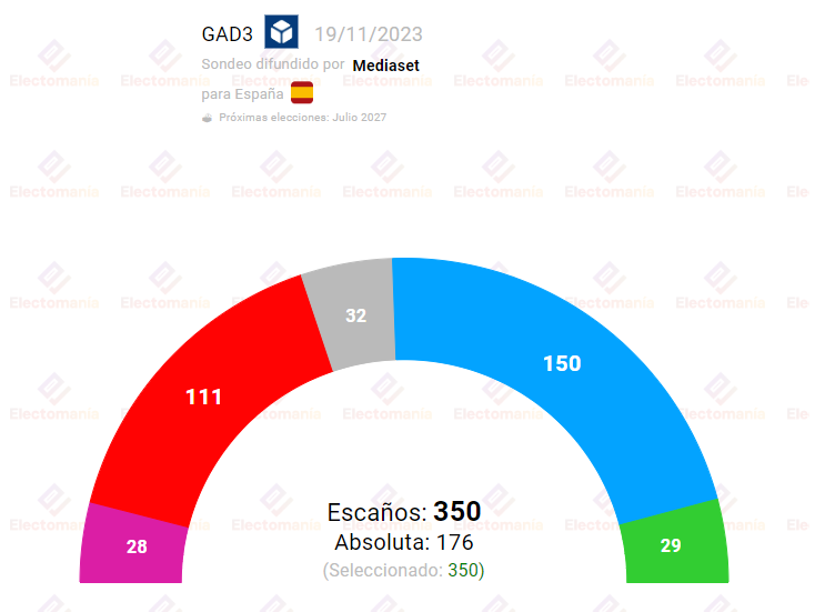La segunda encuesta de GAD3 difundida por Mediaset y recogida por Electomanía otorga al PP 150 escaños si se repitieran las elecciones generales. En segundo lugar, el PSOE se haría con 111 escaños. Vox conseguiría 29. Y Sumar obtendría 28. En este escenario, la suma de PP y Vox alcanzaría la cifra de 179 escaños, justo tres por encima de la mayoría absoluta.