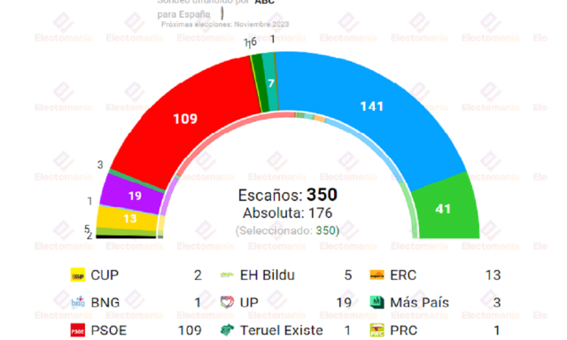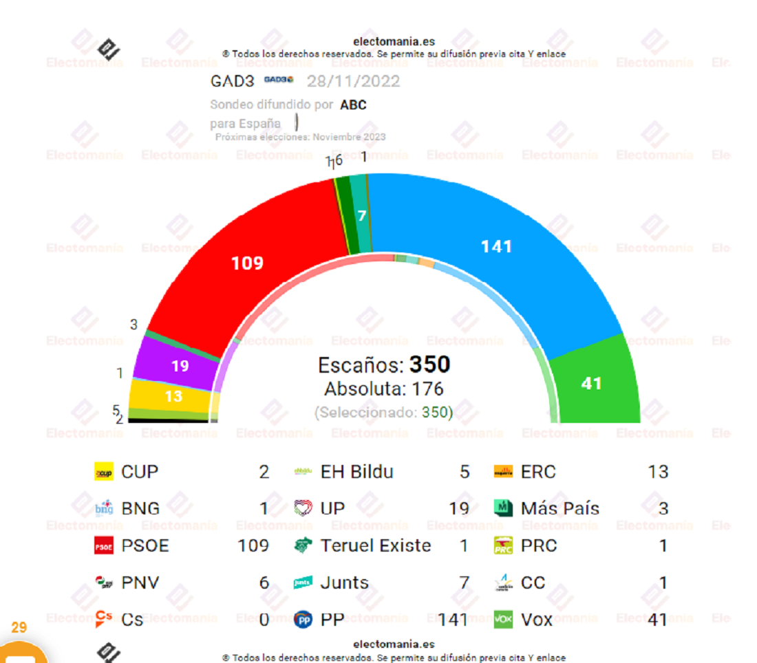 Según la encuesta realizada por GAD3 para ABC, recogida por electomanía, los populares ganarían las elecciones con 141 escaños, sumados a los 41 que obtendrían los de Abascal: conseguirían con holgura la mayoría absoluta, situada en 176 escaños, pese a la gran caída de Vox.