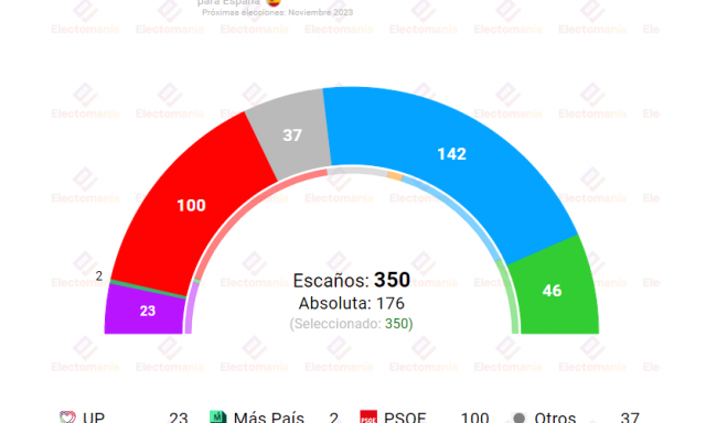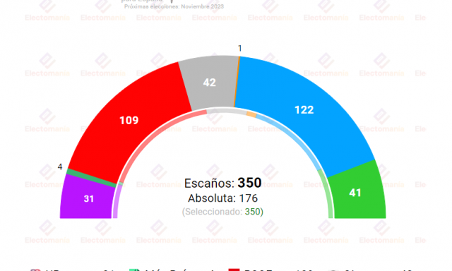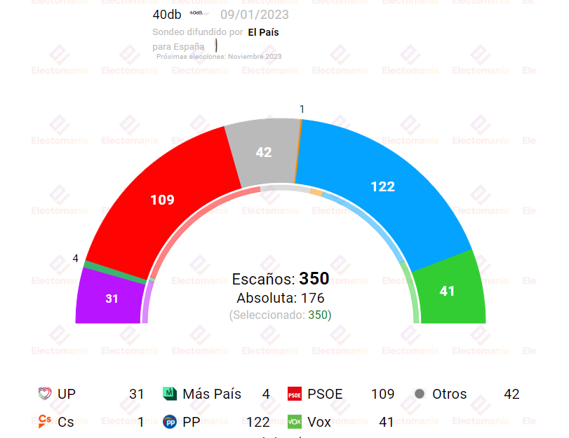 Otro sondeo, de 40db para El País, recogido también por Electomanía, arroja resultados en la misma línea pero, aunque el PP ganaría las elecciones, no conseguiría suficientes apoyos para lograr la absoluta al pactar con Vox. La suma de populares y Vox sería de 147 diputados, a 29 de la absoluta. 122 representantes para Feijóo y 41 para Abascal, insuficientes para formar Gobierno. En esta encuesta, Sánchez cae y se quedaría con 109 socialistas en el hemiciclo, los de Ione Belarra o Yolanda Díaz, aún sin decidir quién será la cabeza de cartel de los morados, se quedarían de cuarta fuerza política con 31 diputados.