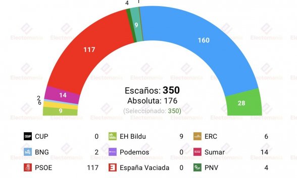 Los de Feijóo conseguirían 160 escaños, junto a los 28 de Vox, superarían holgadamente la mayoría para formar Gobierno, situada en 176 escaños. Por el lado de la izquierda, Podemos quedaría fuera del Congreso, mientras Sumar se haría con 15 y el PSOE con 117.