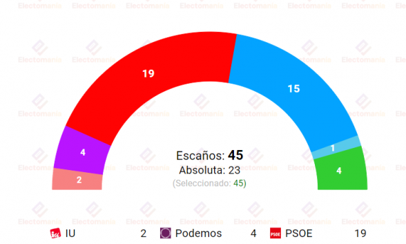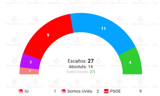 El PSOE, que antes de Canteli, disfrutaba de la alcaldía con Podemos, se queda lejos de gobernar con 9 asientos, Unidas Podemos bajaría de sus tres asientos actuales a dos e Izquierda Unida irrumpe en Oviedo con hasta uno o dos escaños.